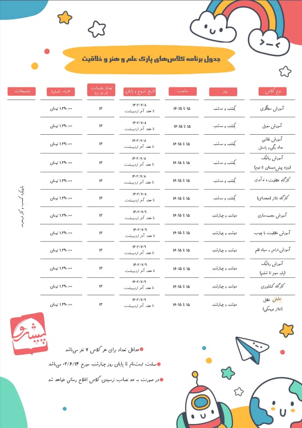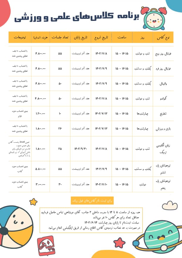 به اطلاع میرساند برنامهی کلاسهای فوق برنامه جهت مشاهده و ثبت نام دانش آموزان در این کلاسها قابل مشاهده میباشد، خواهشمند است جهت ثبت نام از روز شنبه ۱۱ شهریور ماه به آقای عربشاهی، حسابدار مدرسه مراجعه بفرمایید.